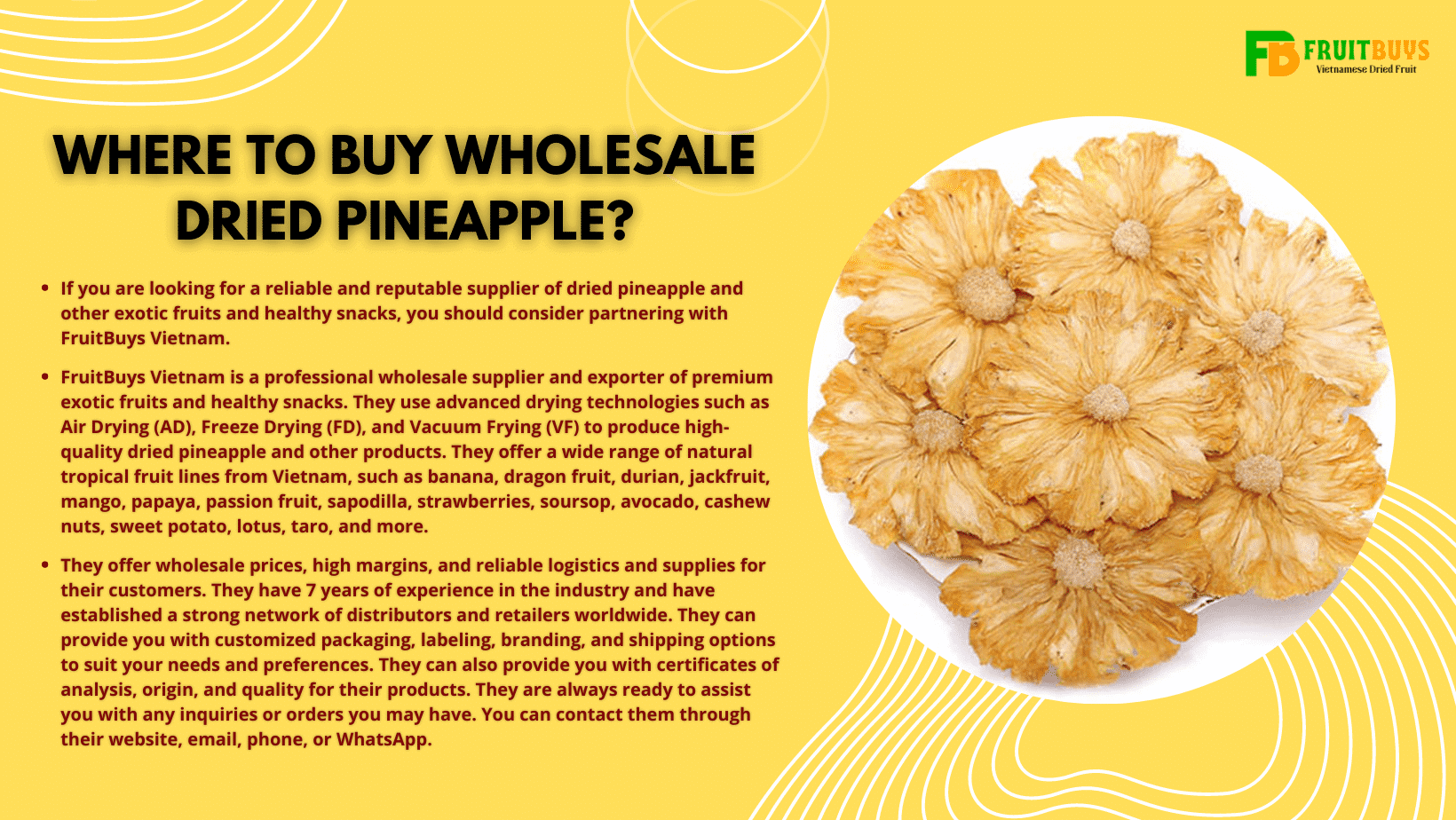 If you are looking for a reliable and reputable supplier of dried pineapple and other exotic fruits and healthy snacks, you should consider partnering with FruitBuys Vietnam. FruitBuys Vietnam is a professional wholesale supplier and exporter of premium exotic fruits and healthy snacks. They use advanced drying technologies such as Air Drying (AD), Freeze Drying (FD), and Vacuum Frying (VF) to produce high-quality dried pineapple and other products. They offer a wide range of natural tropical fruit lines from Vietnam, such as banana, dragon fruit, durian, jackfruit, mango, papaya, passion fruit, sapodilla, strawberries, soursop, avocado, cashew nuts, sweet potato, lotus, taro, and more. They offer wholesale prices, high margins, and reliable logistics and supplies for their customers. They have 7 years of experience in the industry and have established a strong network of distributors and retailers worldwide. They can provide you with customized packaging, labeling, branding, and shipping options to suit your needs and preferences. They can also provide you with certificates of analysis, origin, and quality for their products. They are always ready to assist you with any inquiries or orders you may have. You can contact them through their website, email, phone, or WhatsApp.