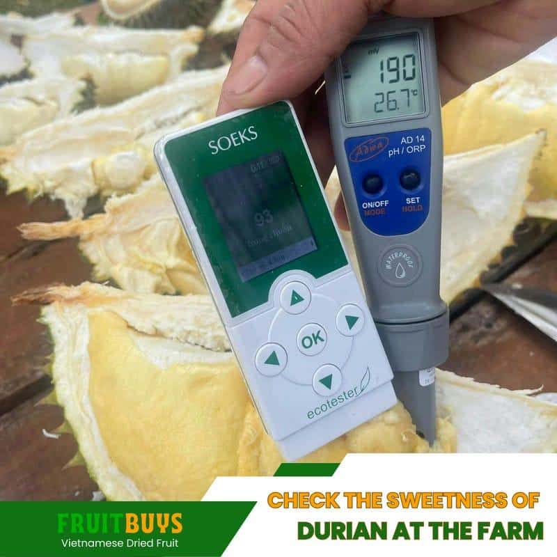 - Selection of raw materials: FruitBuys Vietnam only sources fresh and ripe durians from local farmers who practice natural and sustainable farming methods. The durians are carefully inspected and sorted to ensure they are free from defects, diseases, pests, and contaminants.