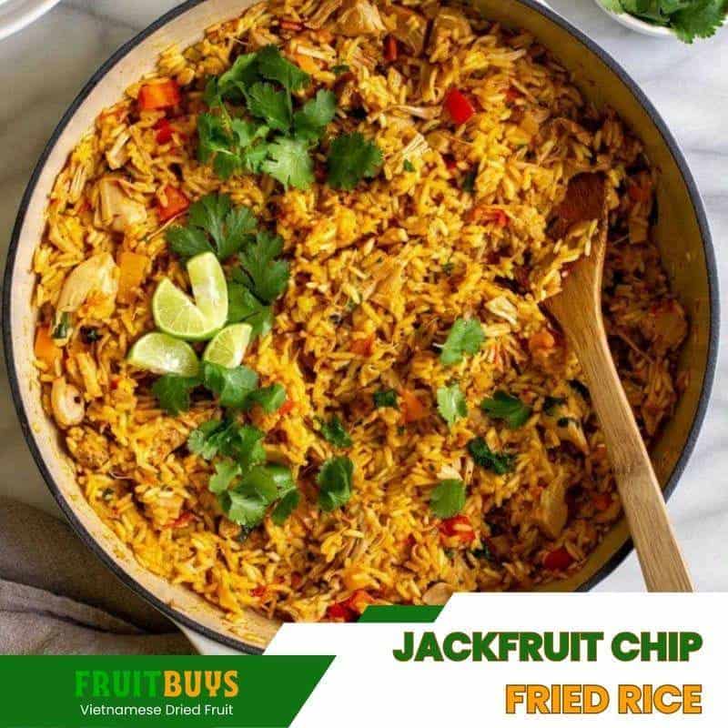 • Jackfruit Chip Fried Rice: This is a hearty dish that mixes jackfruit chips with cooked rice, eggs, green peas, carrots, scallions, and soy sauce. It is a common dish in Indonesia where it is known as nasi goreng jambu biji.