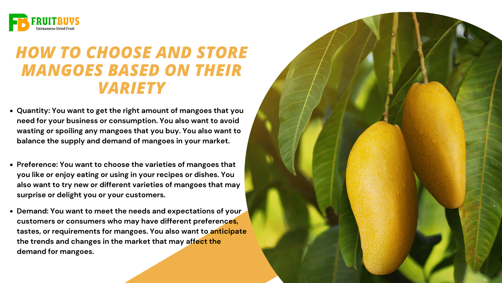 • Preference: You want to choose the varieties of mangoes that you like or enjoy eating or using in your recipes or dishes. You also want to try new or different varieties of mangoes that may surprise or delight you or your customers.